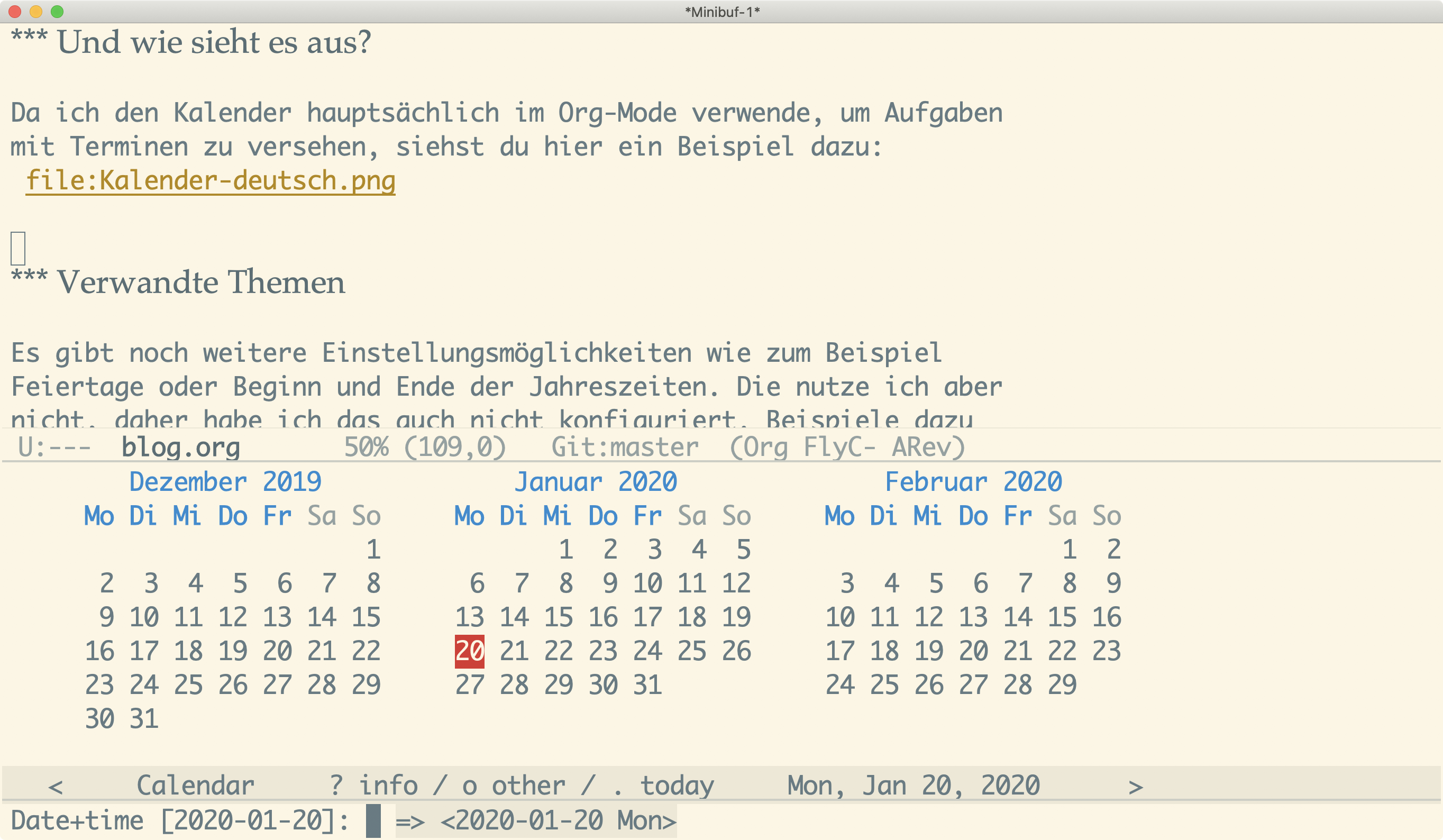 Es gibt noch weitere Einstellungsmöglichkeiten wie zum Beispiel Feiertage oder Beginn und Ende der Jahreszeiten. Die nutze ich aber nicht, daher habe ich das auch nicht konfiguriert. Beispiele dazu findest du im Emacs-Wiki im Artikel zu den Kalendereinstellungen.